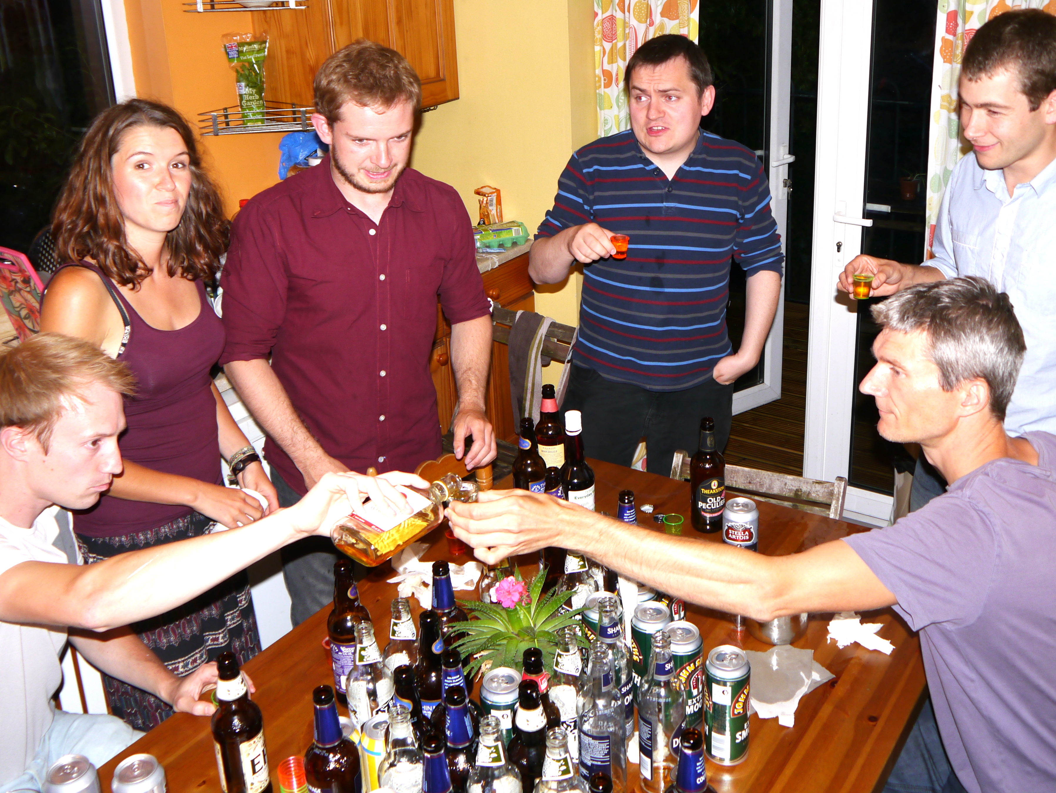 What we do in life echoes in eternity - The Centurion Drinking Challenge. As much fun indoors as you could wish for. Fabian isabout to pop out the pack to urinate on Huw's shed.